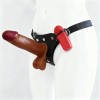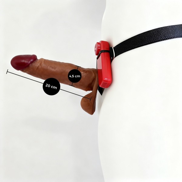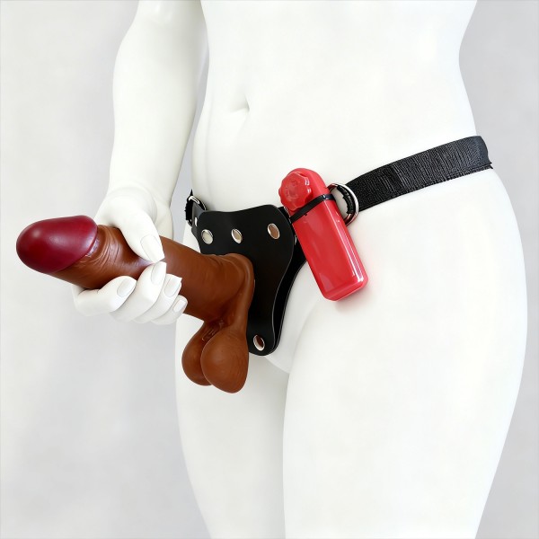 Encaixe a base da prótese na abertura central da cinta até que esteja firme. Posicione a cinta na região pélvica e ajuste as fivelas até sentir que o acessório está seguro e confortável junto ao corpo.