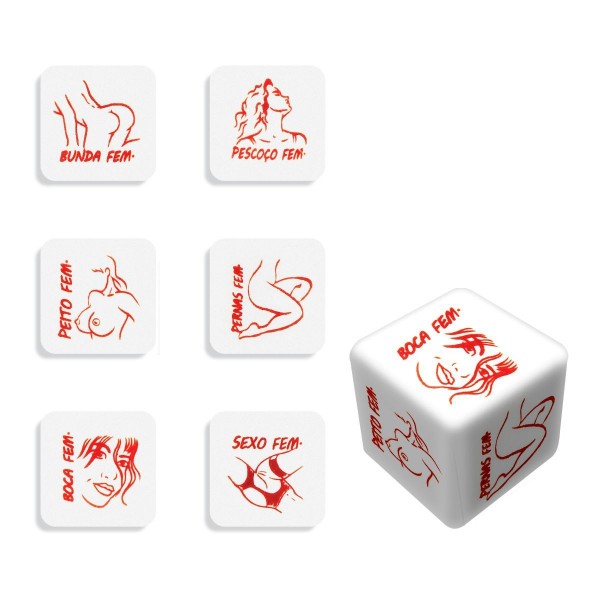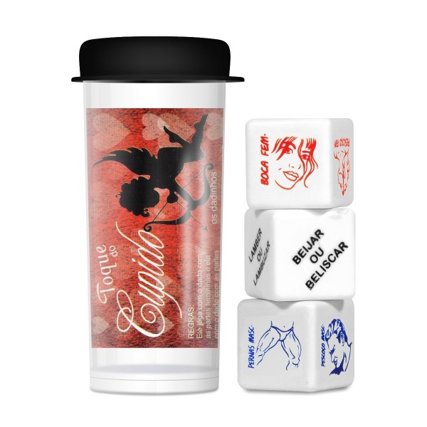 O jogo Toque do Cupido para adultos contém 03 cubos impressos. Um com tarefas beijar ou beliscar, tocar ou apertar, chupar ou morder, abraçar ou se esfregar, lamber ou lambuzar, e acariciar e fazer cócegas. Os outros dois com diferentes desenhos de partes do corpo feminino e masculino.